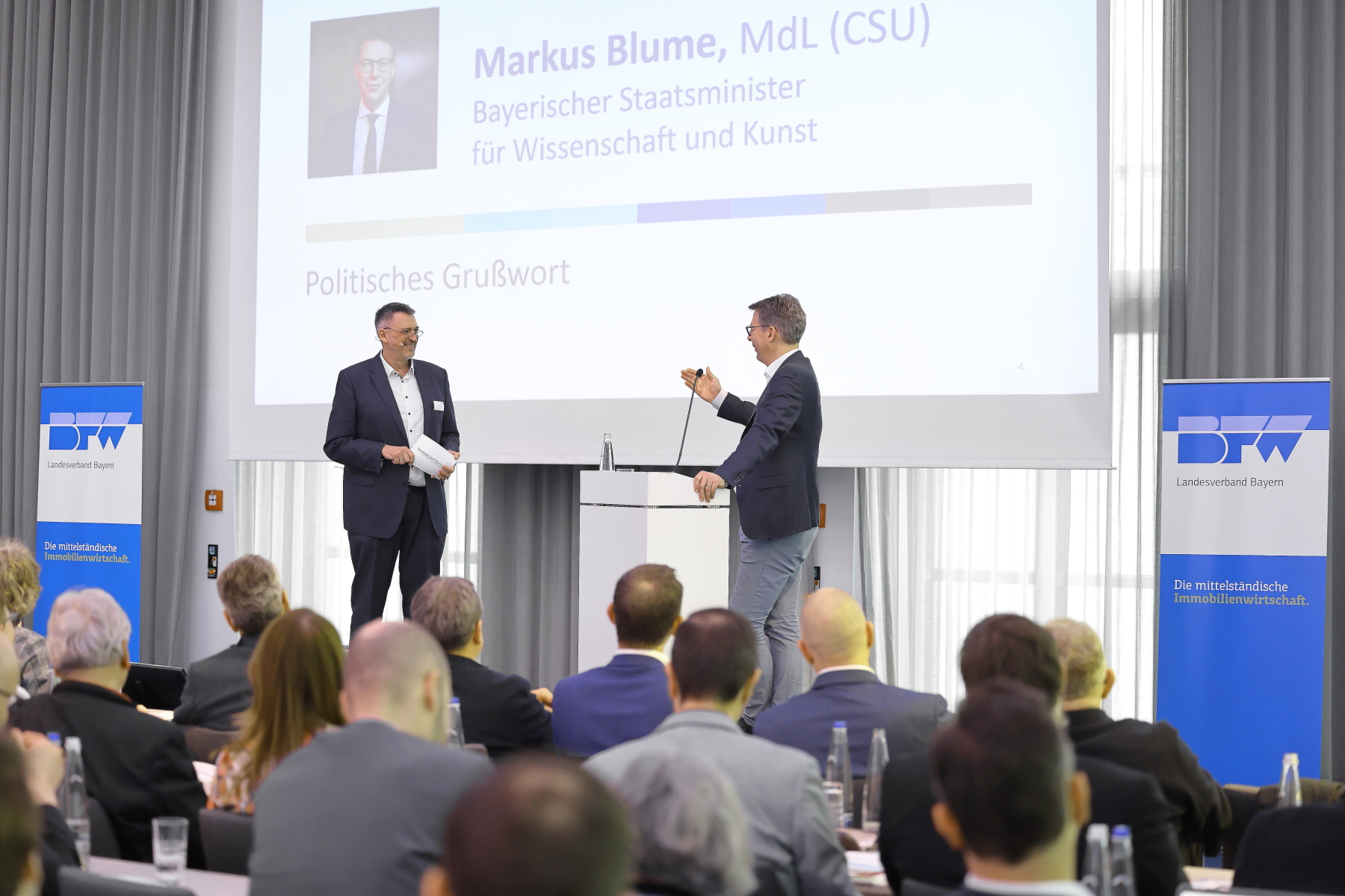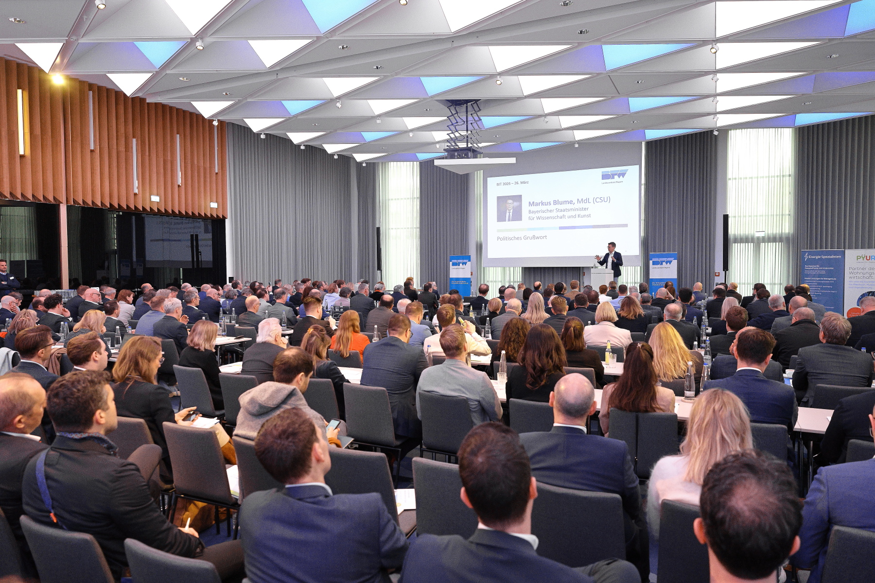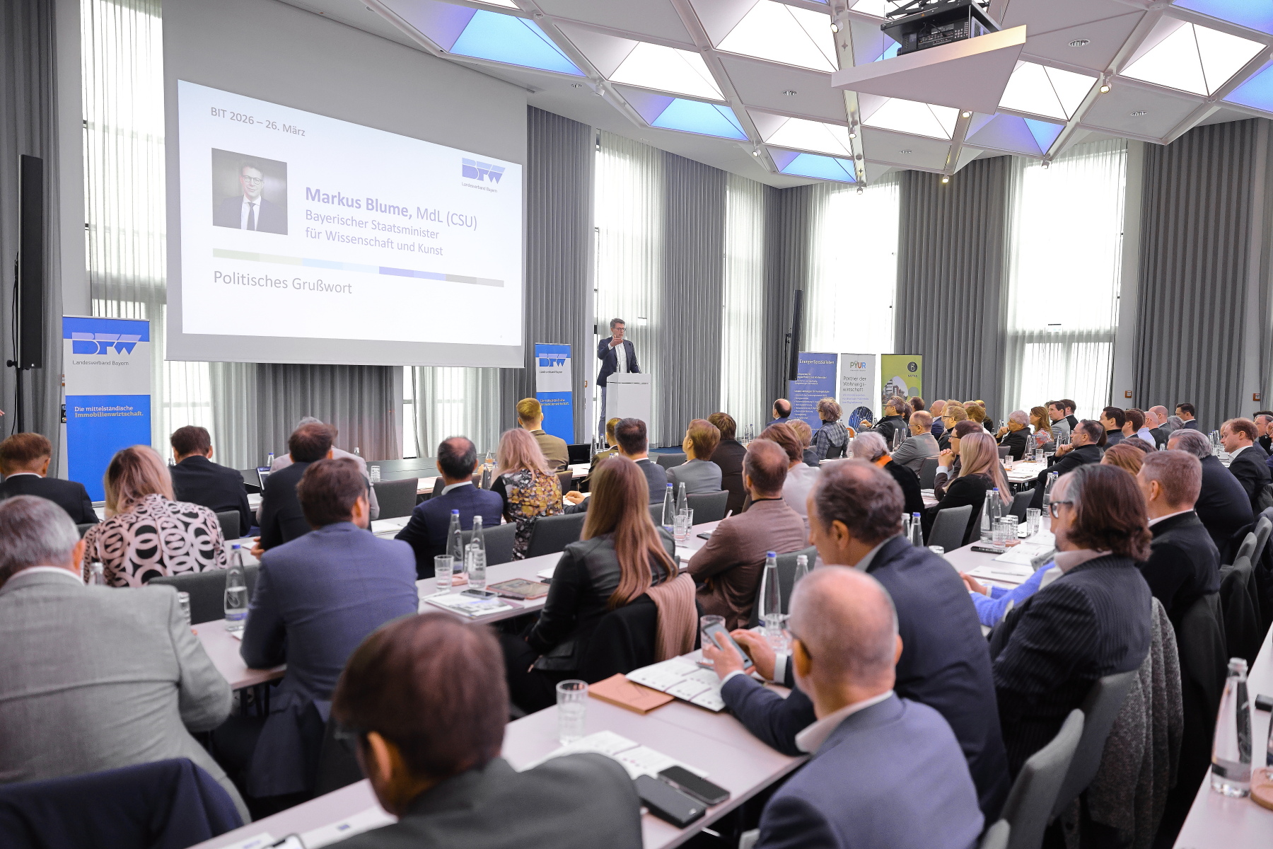 Die enge Verzahnung der Immobilienwirtschaft mit dem Forschungsstandort Bayern spiegelte sich auch im Programm wider: Mit einem politischen Grußwort eröffnete Staatsminister für Wissenschaft und Kunst, Markus Blume, MdL, die Veranstaltung. Im Anschluss boten hochkarätige Fachbeiträge fundierte Einblicke in neue politische Rahmenbedingungen sowie aktuelle Markttrends.