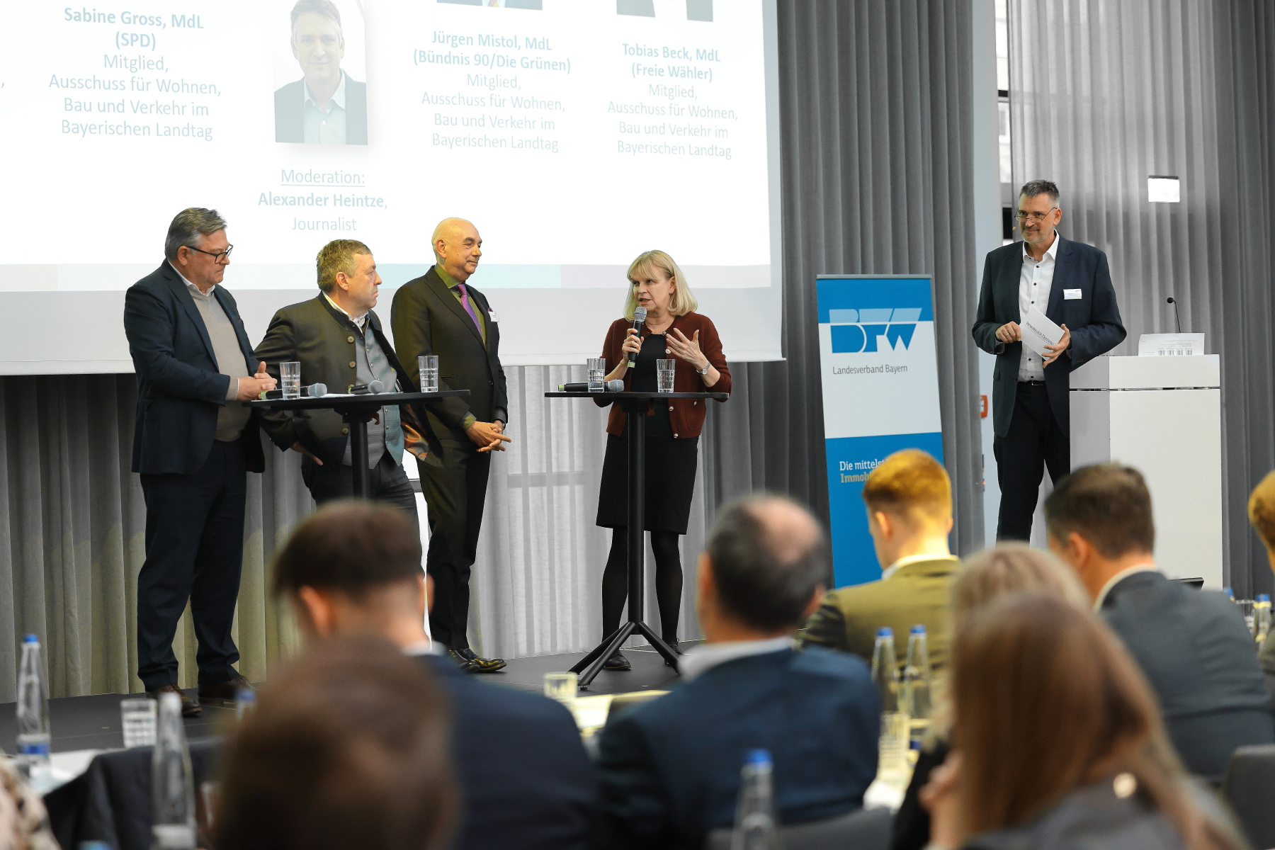 Den politischen Höhepunkt bildete eine Diskussionsrunde mit fachpolitischen Entscheidungsträgern aus dem Bayerischen Landtag. Im Mittelpunkt stand die Frage, welche wirtschaftspolitischen Impulse die Immobilienbranche nach der „Halbzeit“ der laufenden Legislaturperiode noch erwarten darf.